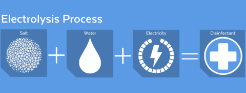 Minerals already existent in the water supplied by the city, or those supplied by creating a salt solution in a brine well, pass through a unit that electrolyzes the water and minerals. When direct electrical current is applied to the salt and water solution in this water disinfection system, it forces the mineral ions apart. When they recombine, one of the products is a weak concentration of chlorine, the element of choice for disinfection.